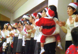 ホールをみんなで作ったクリスマスかざりでかざってクリスマス会をします。うたをうたったり、先生たちの劇をみたりしてすごしていると、やがてサンタさんが…。コーラス同好会のお母さんたちの楽しいクリスマスソングのプレゼントもあるのです。