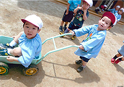 園庭では砂あそび、ボールあそび、三輪車、てつぼう、スベリ台…。プレイルームでは、おままごと、スタンプあそび…。絵本コーナーでは、ソファーにもたれかかって好きな絵本に見入っています。各保育室の中でも、おうちごっこやウルトラマンごっこなど毎日変化にとんだあそびが自由な発想で展開されています。